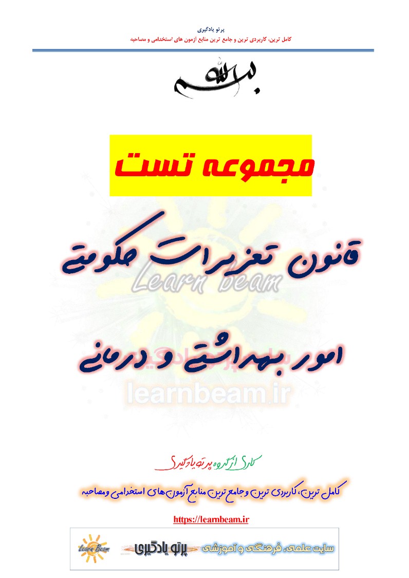 سوالات تستی قانون تعزیرات حکومتی امور بهداشتی و درمانی شامل 136 تست در 49 صفحه در قالب فایل pdf با پاسخ تشریحی قابل چاپ با کیفیت عالی جهت انسجام ذهنی، خودآزمایی و مطالعه سریع داوطلبین شرکت کننده در آزمون های استخدامی و دوازدهمین امتحان مشترک فراگیر دستگاه های اجرایی کشور مطابق با دفترچه ثبت نام و مطابق با سرفصل های اعلام شده در دفترچه راهنمای ثبت نام می باشد.
