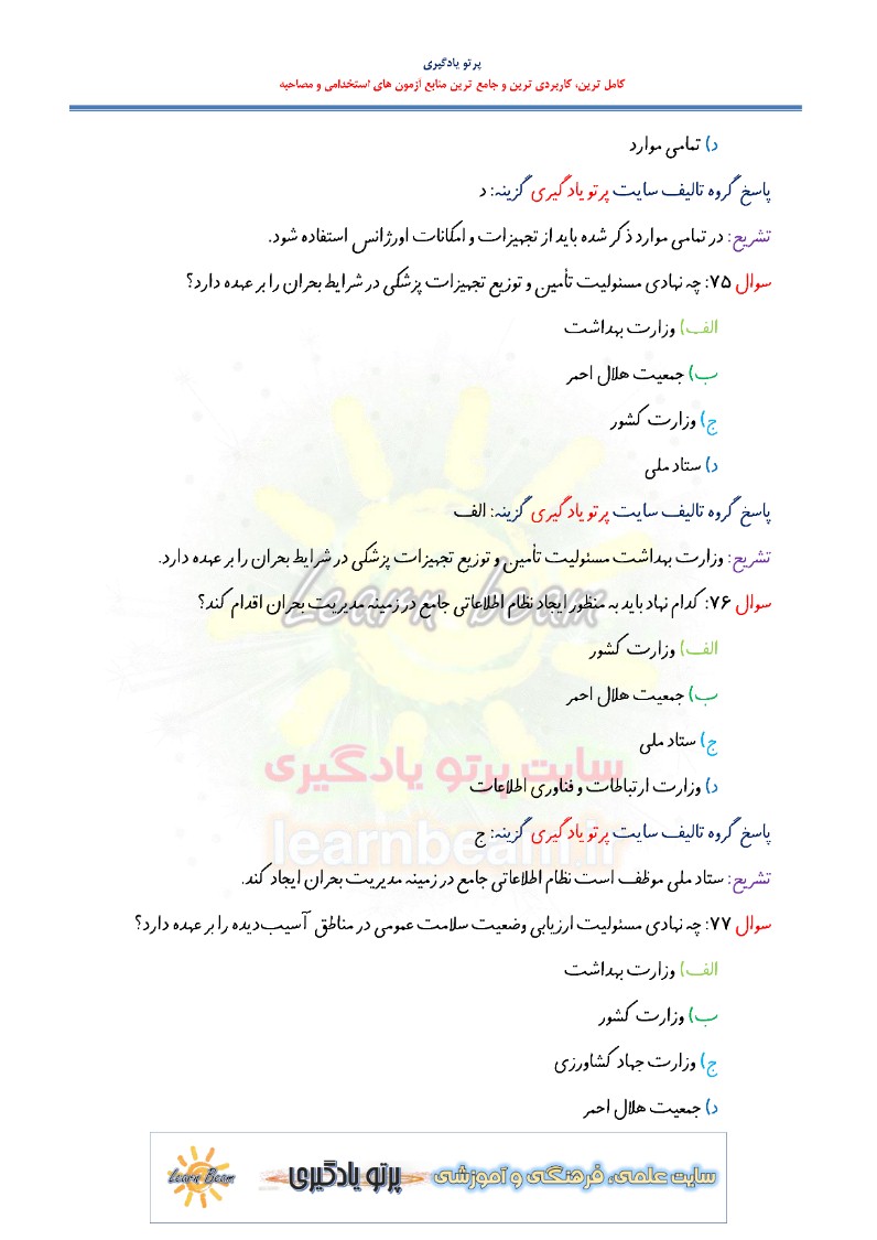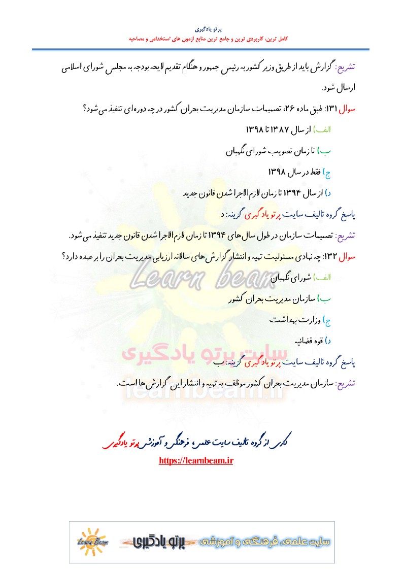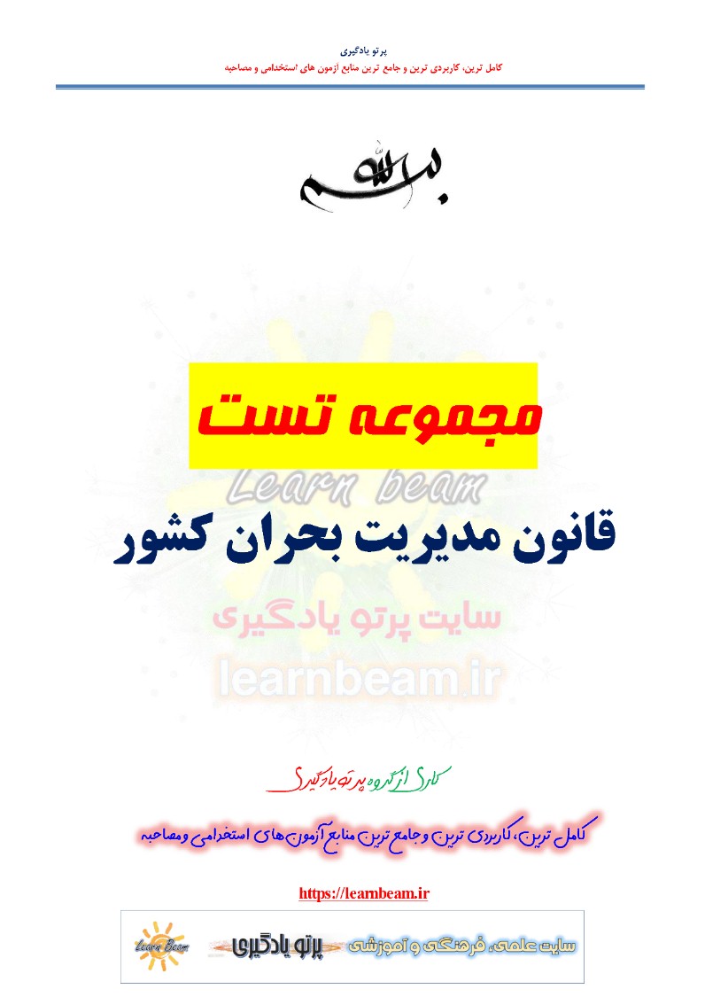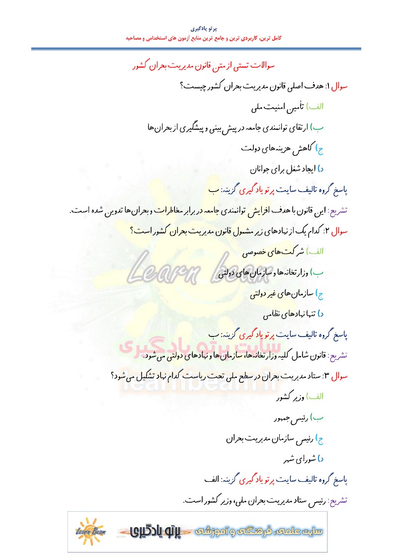 سوالات تستی قانون مدیریت بحران کشور شامل 132 تست در 52 صفحه در قالب فایل pdf با پاسخ تشریحی قابل چاپ با کیفیت عالی جهت انسجام ذهنی، خودآزمایی و مطالعه سریع داوطلبین شرکت کننده در آزمون های استخدامی و دوازدهمین امتحان مشترک فراگیر دستگاه های اجرایی کشور مطابق با دفترچه ثبت نام و مطابق با سرفصل های اعلام شده در دفترچه راهنمای ثبت نام می باشد.