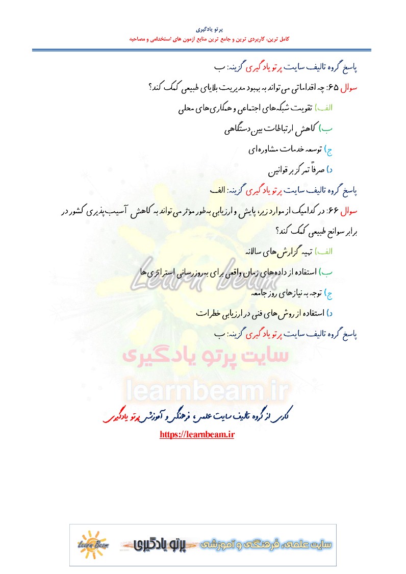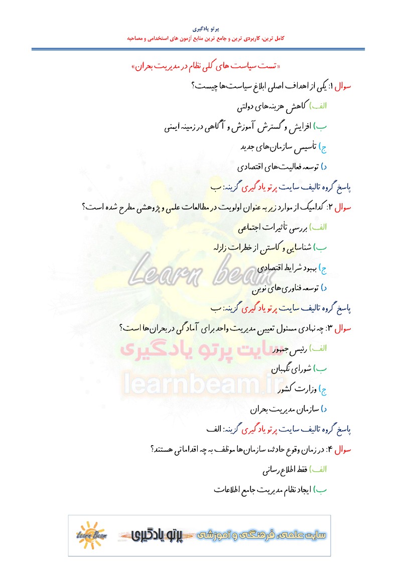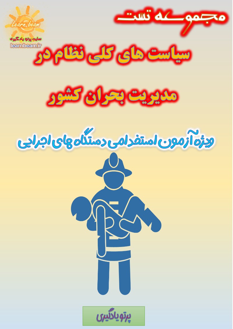 سوالات تستی سیاست های کلی نظام در مدیریت بحران شامل 66 تست در 20 صفحه در قالب فایل pdf قابل چاپ با کیفیت عالی جهت انسجام ذهنی، خودآزمایی و مطالعه سریع داوطلبین شرکت کننده در آزمون های استخدامی و دوازدهمین امتحان مشترک فراگیر دستگاه های اجرایی کشور مطابق با دفترچه ثبت نام و مطابق با سرفصل های اعلام شده در دفترچه راهنمای ثبت نام می باشد.