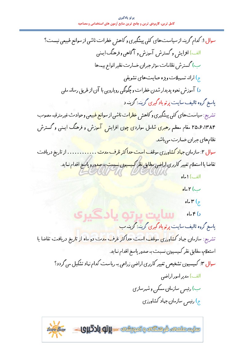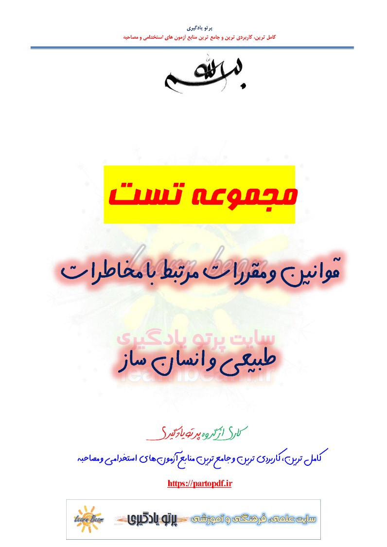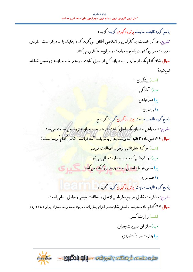 سوالات تستی قوانین و مقررات مرتبط با مخاطرات طبیعی و انسان ساز شامل 45 تست در 18 صفحه با پاسخ تشریحی در قالب فایل pdf قابل چاپ با کیفیت عالی جهت انسجام ذهنی، خودآزمایی و مطالعه سریع داوطلبین شرکت کننده در آزمون های استخدامی و دوازدهمین امتحان مشترک فراگیر دستگاه های اجرایی کشور مطابق با دفترچه ثبت نام و مطابق با سرفصل های اعلام شده در دفترچه راهنمای ثبت نام می باشد.