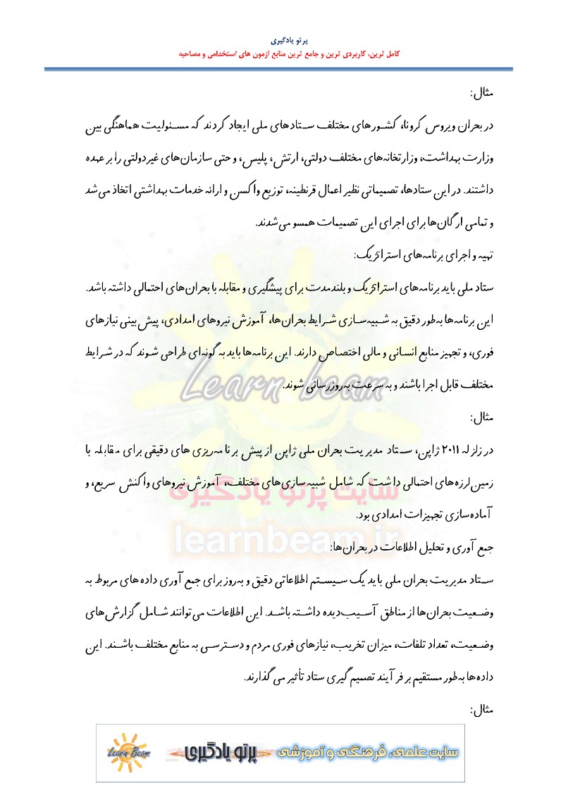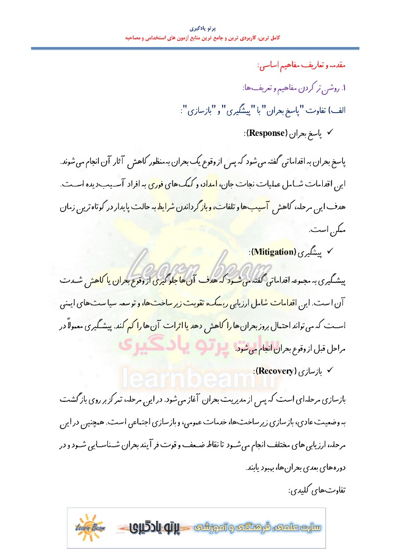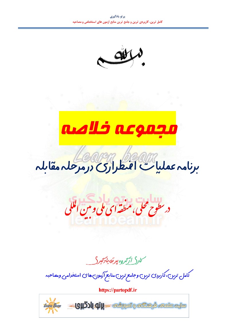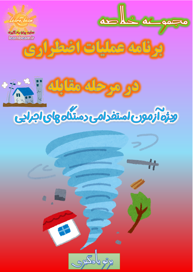 خلاصه برنامه عملیات اضطراری در مرحله مقابله در سطوح محلی منطقه ای ملی و بین المللی در 49 صفحه در قالب فایل pdf قابل چاپ با کیفیت عالی جهت انسجام ذهنی، خودآزمایی و مطالعه سریع داوطلبین شرکت کننده در آزمون های استخدامی و دوازدهمین امتحان مشترک فراگیر دستگاه های اجرایی کشور مطابق با دفترچه ثبت نام و مطابق با سرفصل های اعلام شده در دفترچه راهنمای ثبت نام می باشد.