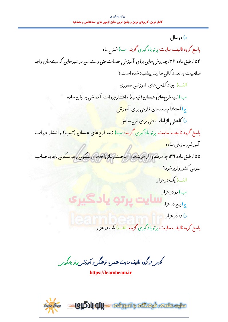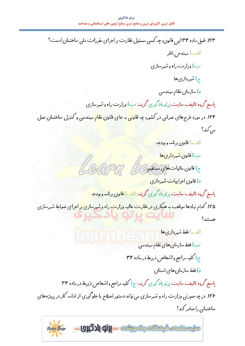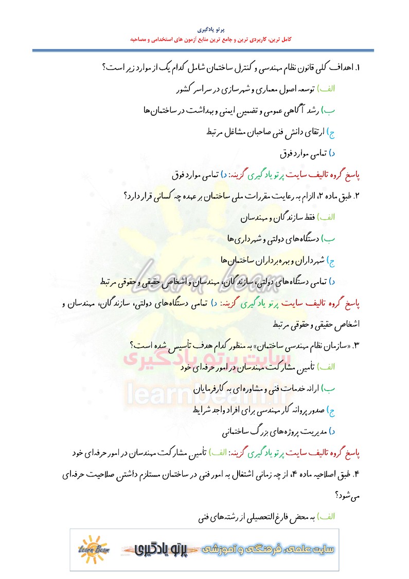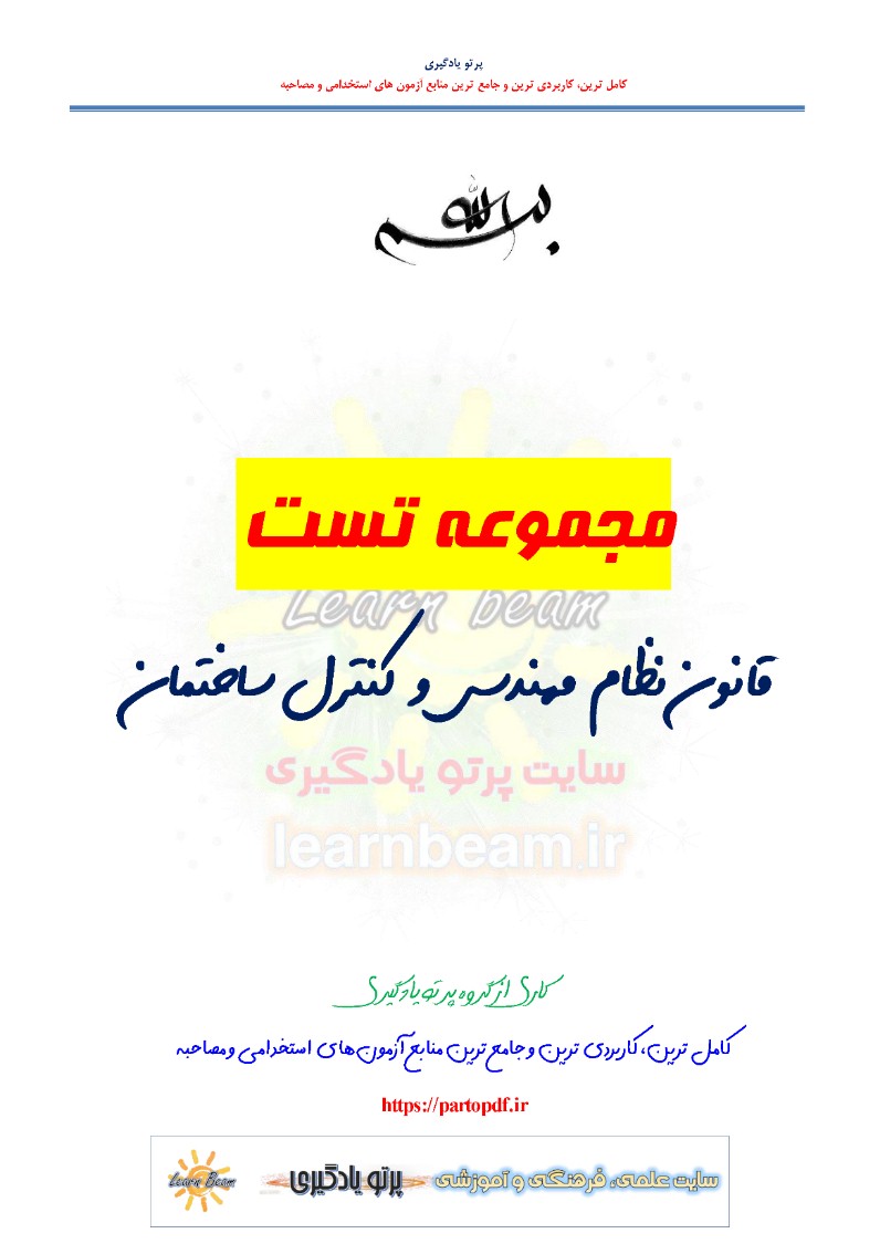 سوالات تستی قانون نظام مهندسی و کنترل ساختمان شامل 155 سوال تستی در 48 صفحه در قالب فایل pdf قابل چاپ با کیفیت عالی جهت انسجام ذهنی، خودآزمایی و مطالعه سریع داوطلبین شرکت کننده در آزمون های استخدامی و دوازدهمین امتحان مشترک فراگیر دستگاه های اجرایی کشور مطابق با دفترچه ثبت نام و مطابق با سرفصل های اعلام شده در دفترچه راهنمای ثبت نام می باشد.