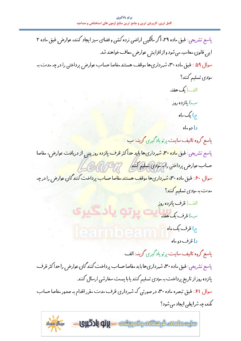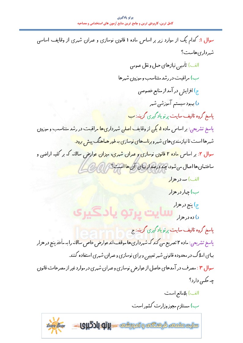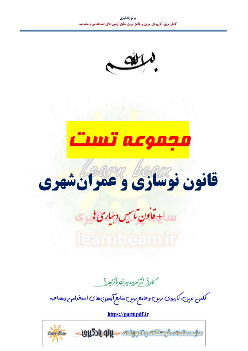 سوالات تستی قانون نوسازی و عمران شهری و قانون تأسیس دهیاریهای خودکفا شامل 83 سوال تستی در 35 صفحه با پاسخ تشریحی در قالب فایل pdf قابل چاپ با کیفیت عالی جهت انسجام ذهنی، خودآزمایی و مطالعه سریع داوطلبین شرکت کننده در آزمون های استخدامی و دوازدهمین امتحان مشترک فراگیر دستگاه های اجرایی کشور مطابق با دفترچه ثبت نام و مطابق با سرفصل های اعلام شده در دفترچه راهنمای ثبت نام می باشد.