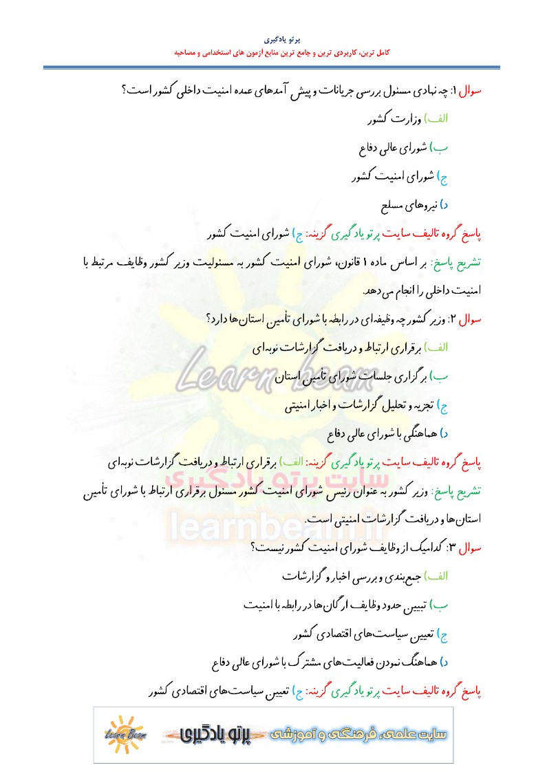 سوالات تستی قانون تعیین وظایف و تشکیلات شورای امنیت کشور شامل 40 سوال تستی در 17 صفحه با پاسخ تشریحی در قالب فایل pdf قابل چاپ با کیفیت عالی جهت انسجام ذهنی، خودآزمایی و مطالعه سریع داوطلبین شرکت کننده در آزمون های استخدامی و دوازدهمین امتحان مشترک فراگیر دستگاه های اجرایی کشور مطابق با دفترچه ثبت نام و مطابق با سرفصل های اعلام شده در دفترچه راهنمای ثبت نام می باشد.