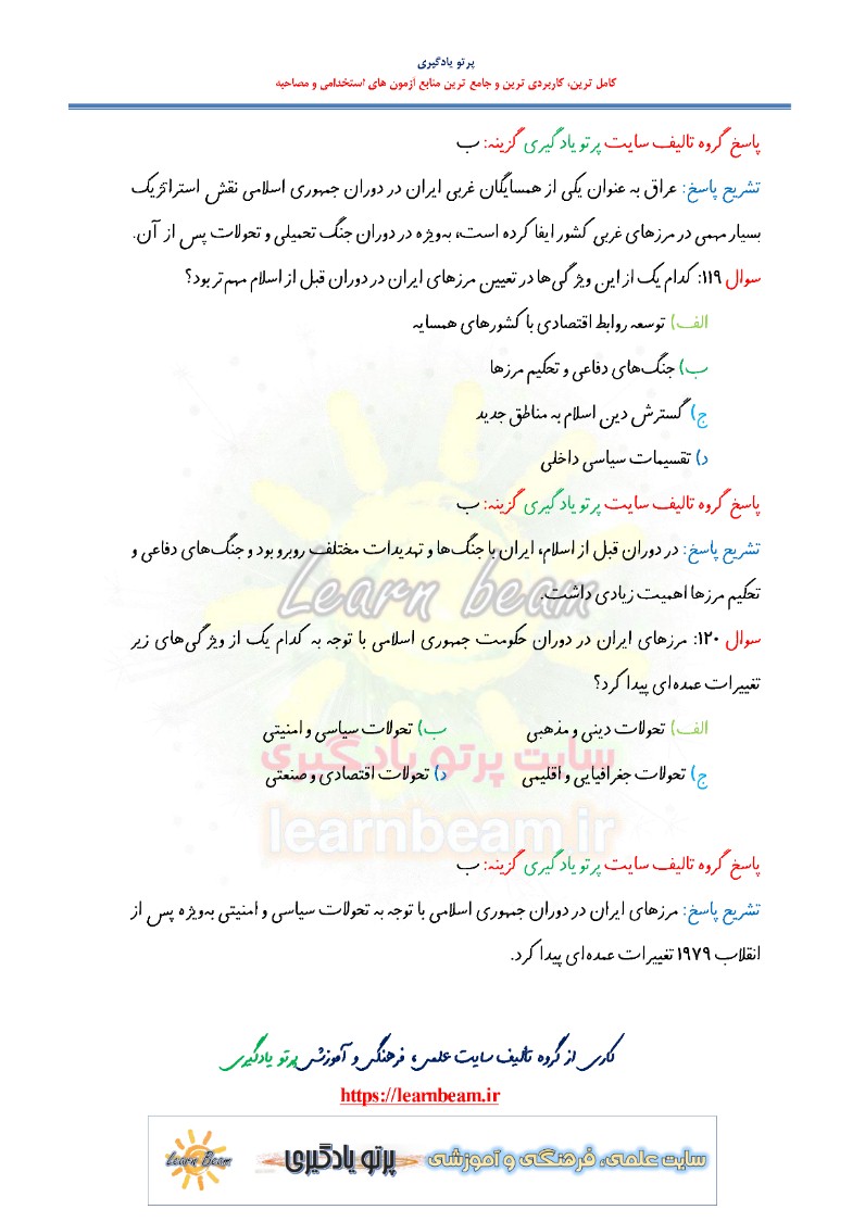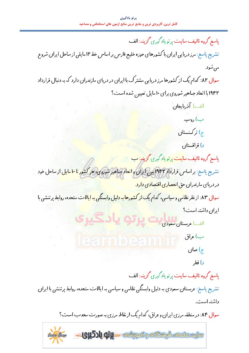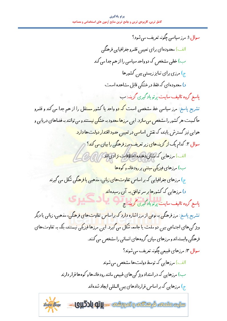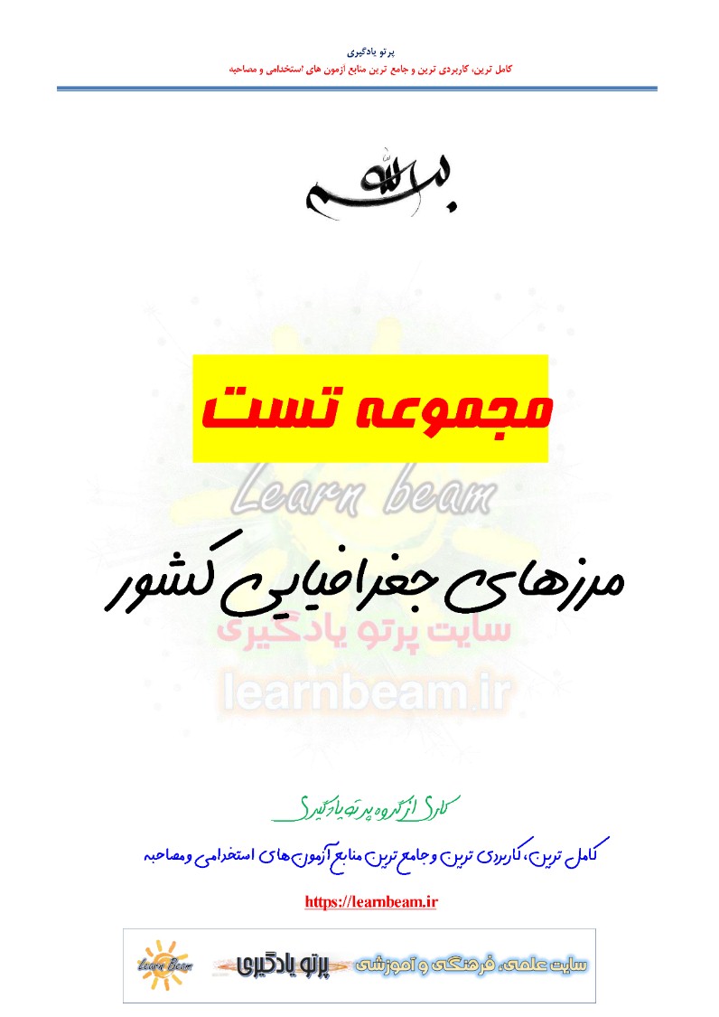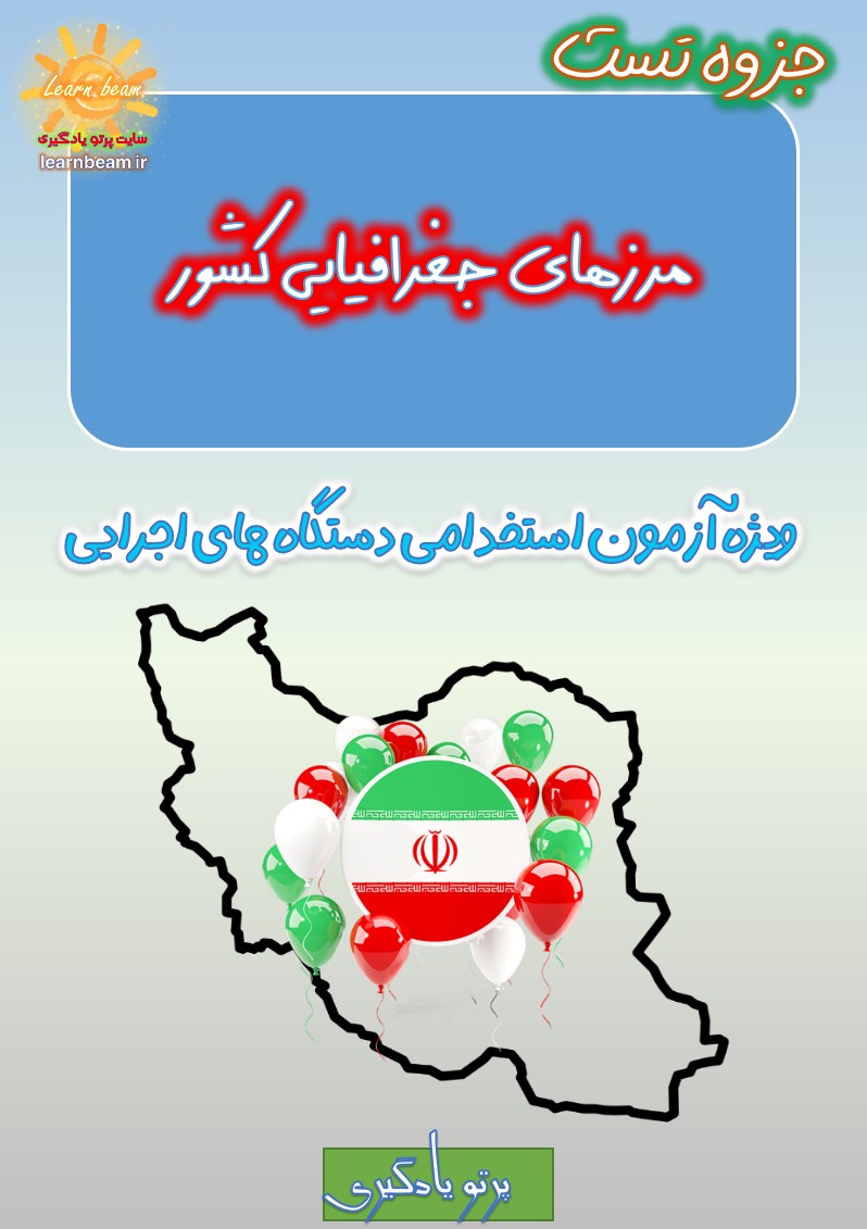 سوالات تستی مرزهای جغرافیایی کشور شامل 120 سوال تستی در 47 صفحه با پاسخ تشریحی در قالب فایل pdf قابل چاپ با کیفیت عالی جهت انسجام ذهنی، خودآزمایی و مطالعه سریع داوطلبین شرکت کننده در آزمون های استخدامی و دوازدهمین امتحان مشترک فراگیر دستگاه های اجرایی کشور مطابق با دفترچه ثبت نام و مطابق با سرفصل های اعلام شده در دفترچه راهنمای ثبت نام می باشد.